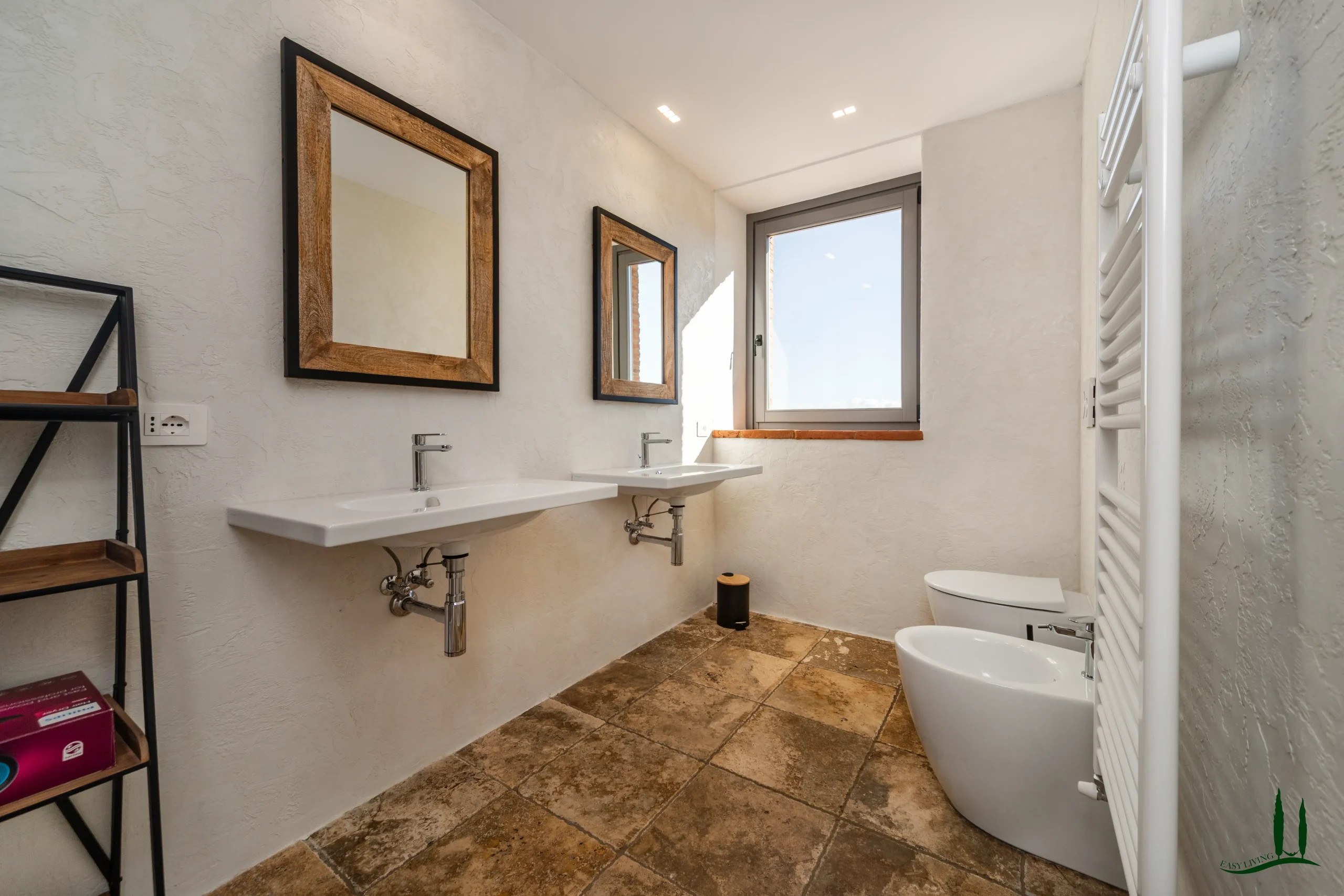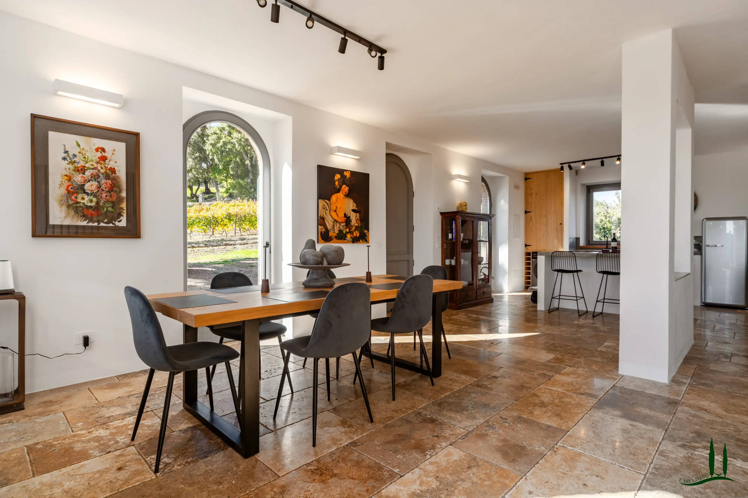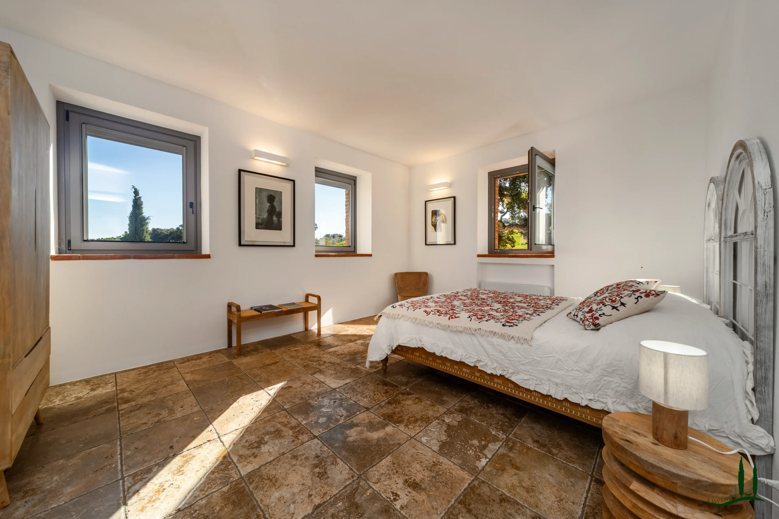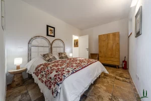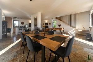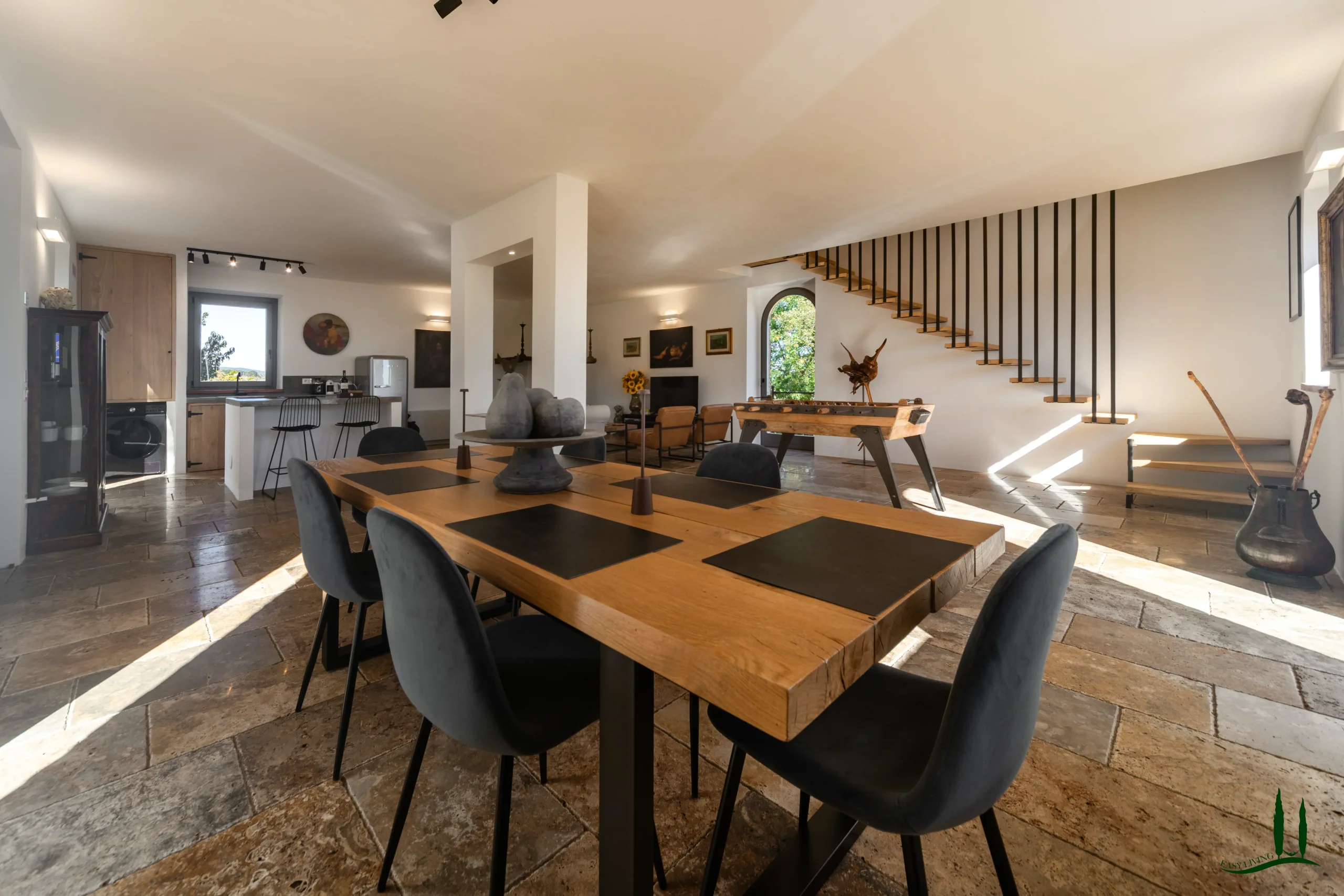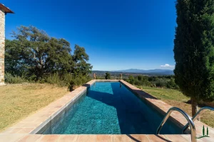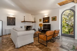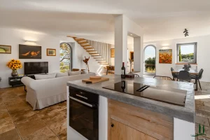 The villa (approx. 280 m²) has been carefully renovated with a focus on authenticity and sustainability, achieving an A4 energy rating. The ground floor is a welcoming open-plan living space with a cozy lounge, dining area, and custom-designed kitchen. A sculptural staircase leads to the upper floor, where three serene bedrooms each offer private en-suite bathrooms and views over the surrounding hills.