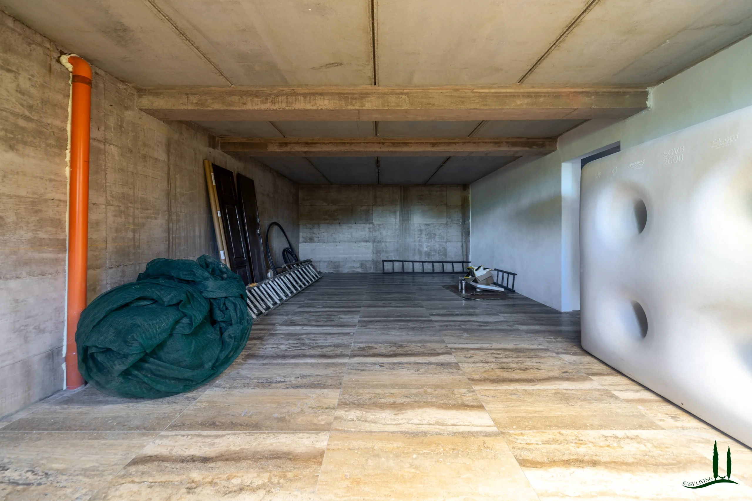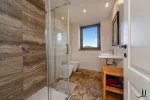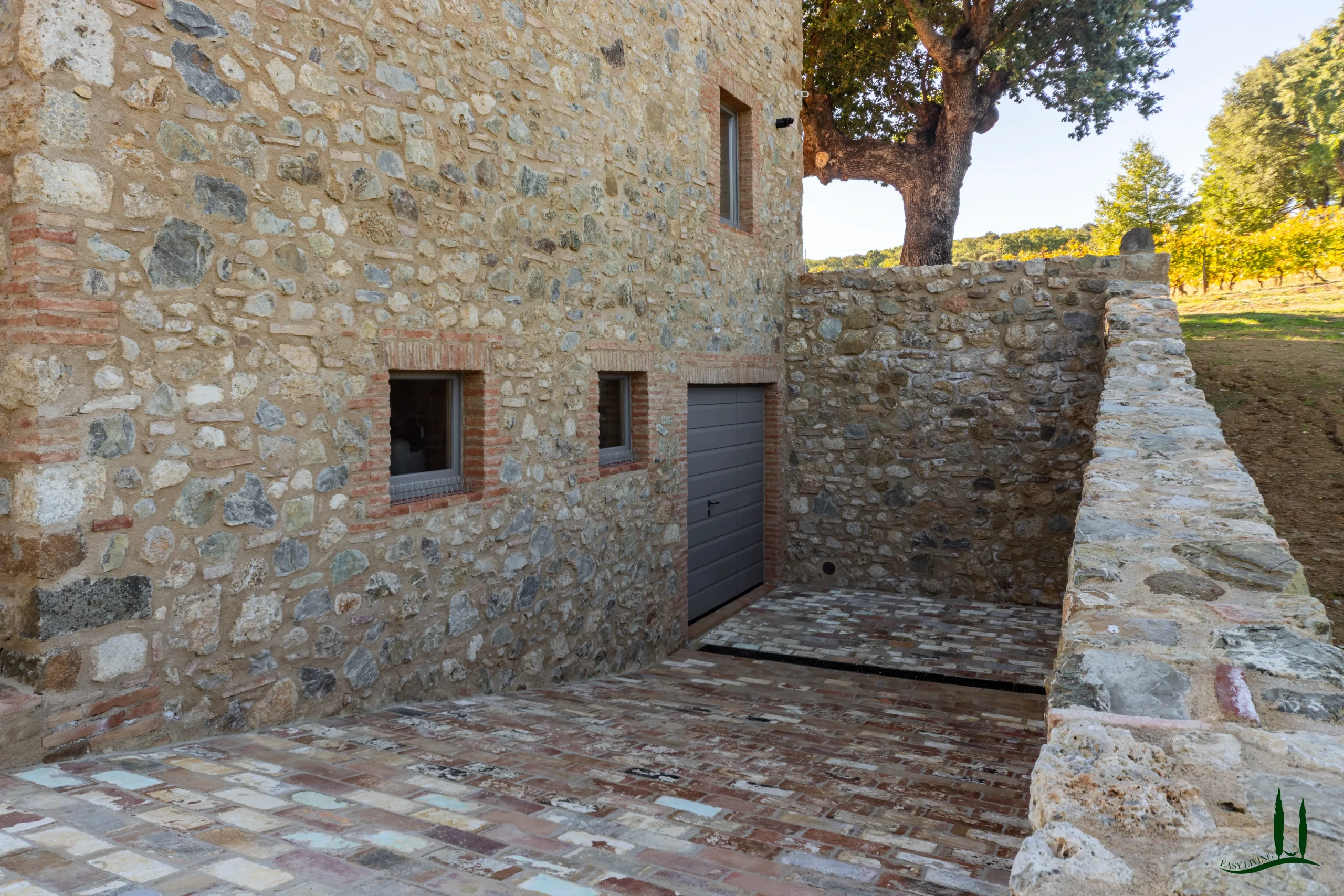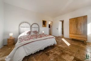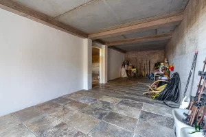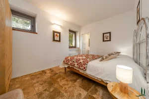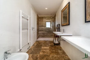 On the lower ground level, a paved ramp leads to two spacious service rooms: a garage and a temperature-stable storage space used for preserving the property’s own wine and olive oil—though this area could also be reimagined as a wellness or fitness space.