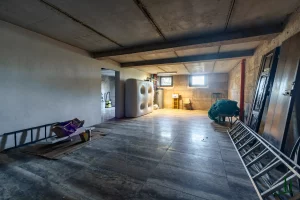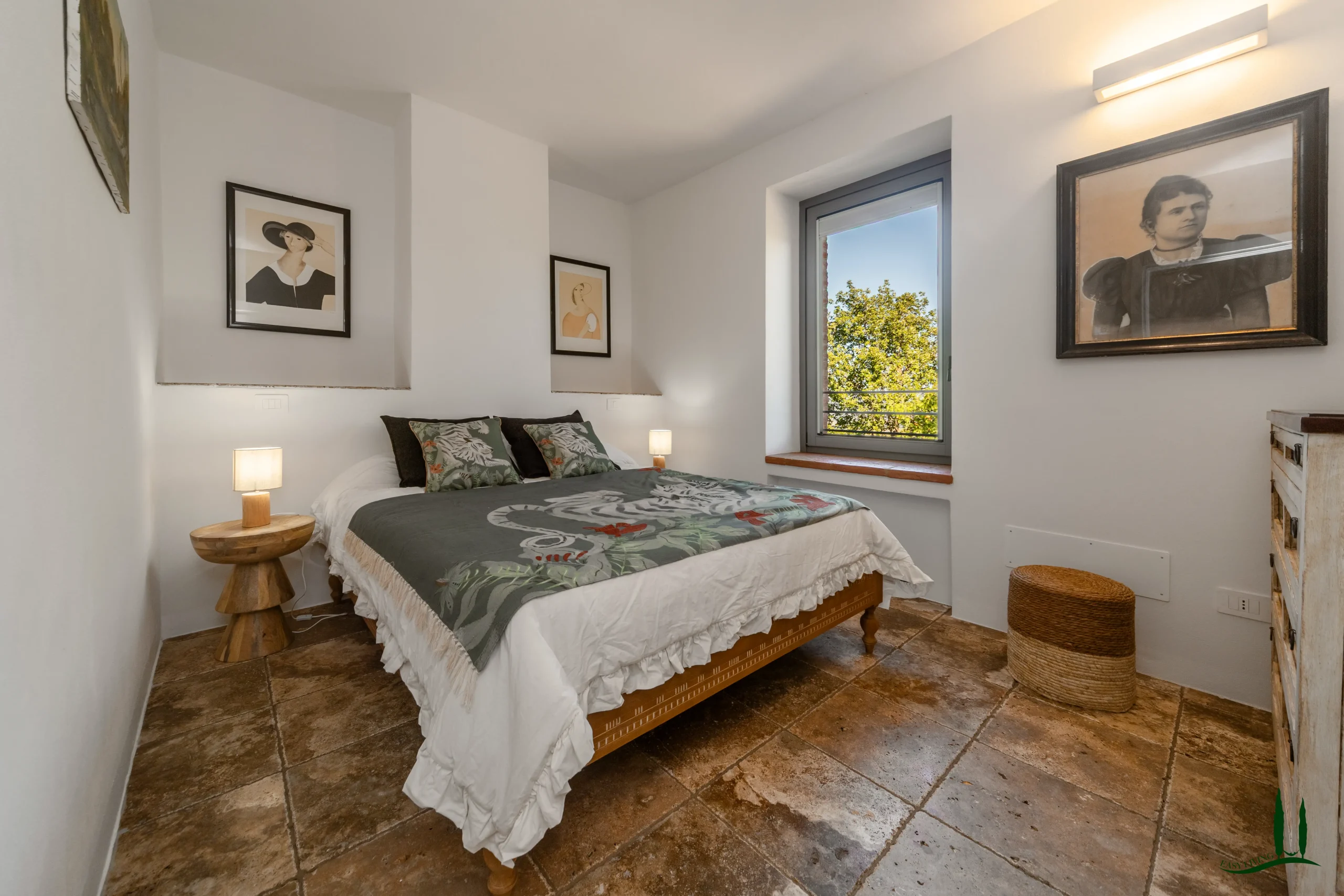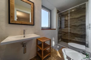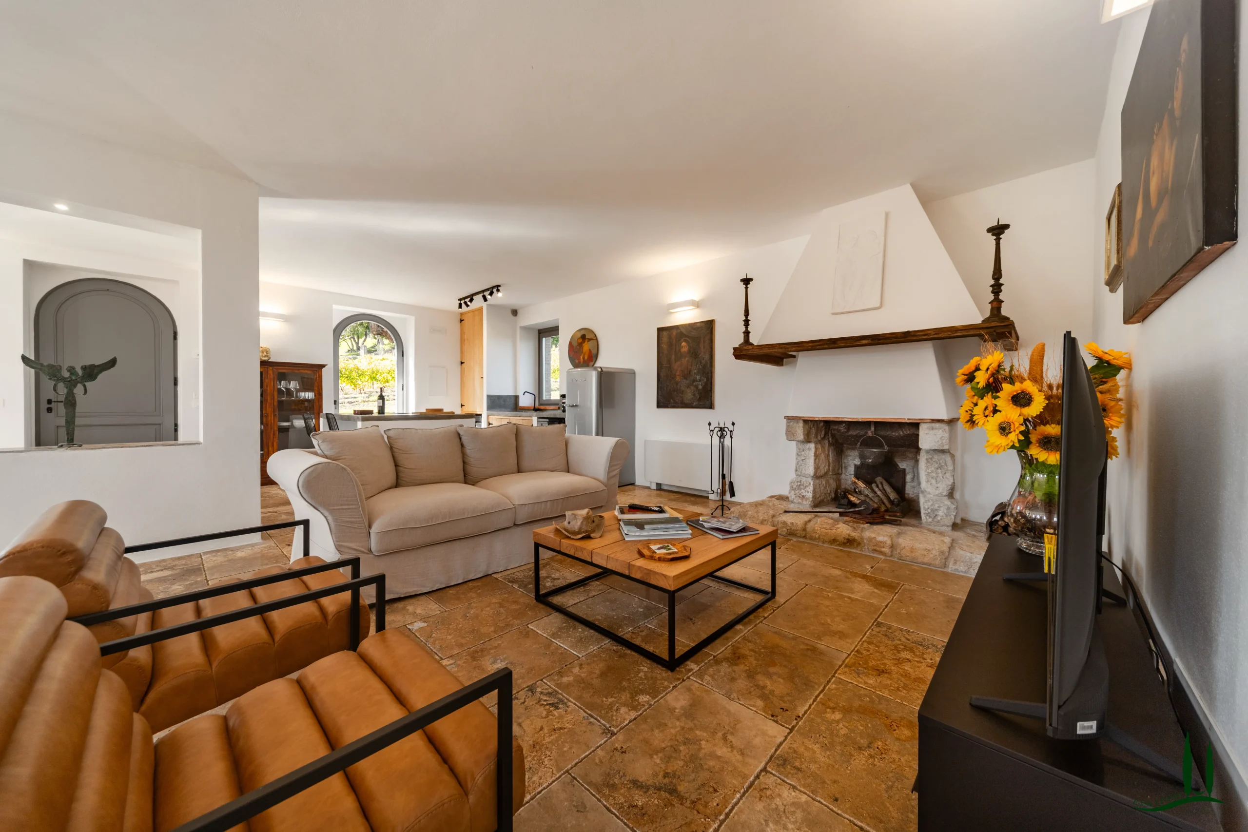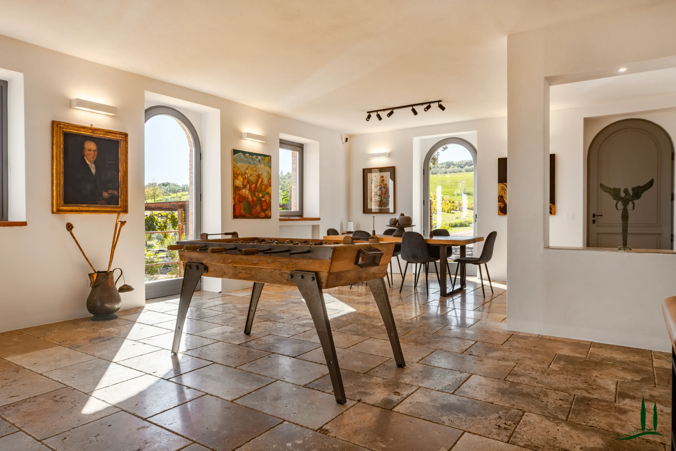 On the lower ground level, a paved ramp leads to two spacious service rooms: a garage and a temperature-stable storage space used for preserving the property’s own wine and olive oil—though this area could also be reimagined as a wellness or fitness space.