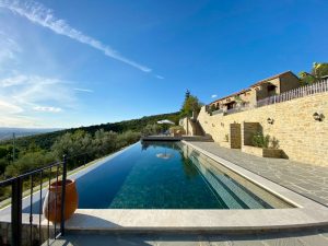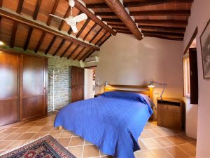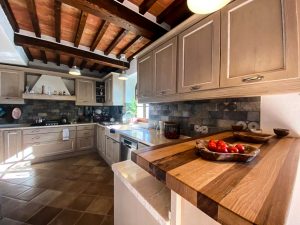 The farmhouse, which dates back almost 200 years, has been meticulously restored to preserve its original character while incorporating modern comforts. It includes a spacious, light-filled ground floor with a kitchen, dining room, living room with a traditional stone fireplace, and a study. Upstairs, three elegant bedrooms each feature en-suite bathrooms, with the master suite enjoying direct access to a panoramic terrace. The house has underfloor heating on the ground floor and radiators powered by a pellet stove or LPG gas upstairs.